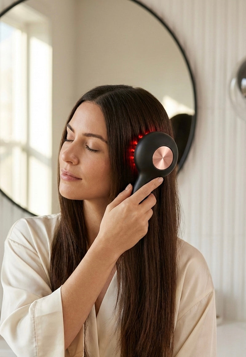 Whether it started after pregnancy, during a stressful year, or just slowly crept up on you — watching your hair thin is exhausting. The wider part line. The ponytail that keeps getting thinner. The hair on the shower floor that wasn’t there before. You’ve tried the oils. You’ve Googled everything. You’ve considered PRP injections at $3,000+. But what if there was a way to fight back from home, in 5 minutes a day, for less than a dinner out?